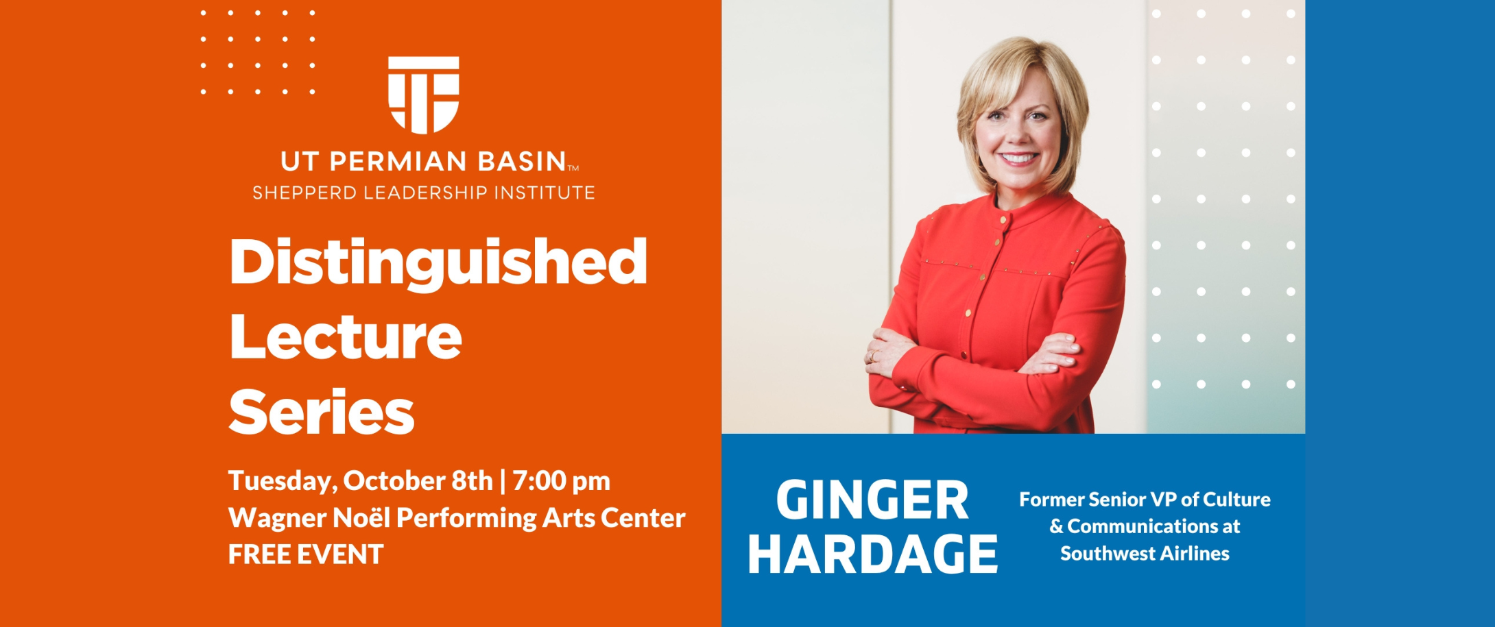 Join the Shepperd Leadership Institute for an inspiring evening with Ginger Hardage, renowned expert in corporate culture and former Senior Vice President of Culture and Communications at Southwest Airlines, as part of the Distinguished Lecture Series at the University of Texas Permian Basin.